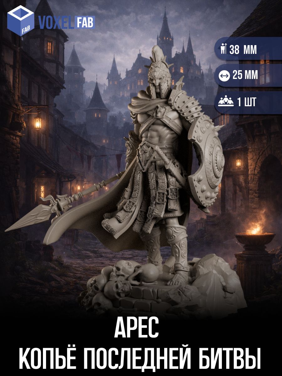 Арес — воин, который не торопится объявлять себя победителем: он стоит так, будто финал битвы ещё не наступил, и потому каждое движение должно быть точным. На его доспехах — следы долгого пути и привычка встречать опасность лицом к лицу, а тяжёлый щит говорит о дисциплине, выучке и упрямстве, которое не сгибается под давлением.