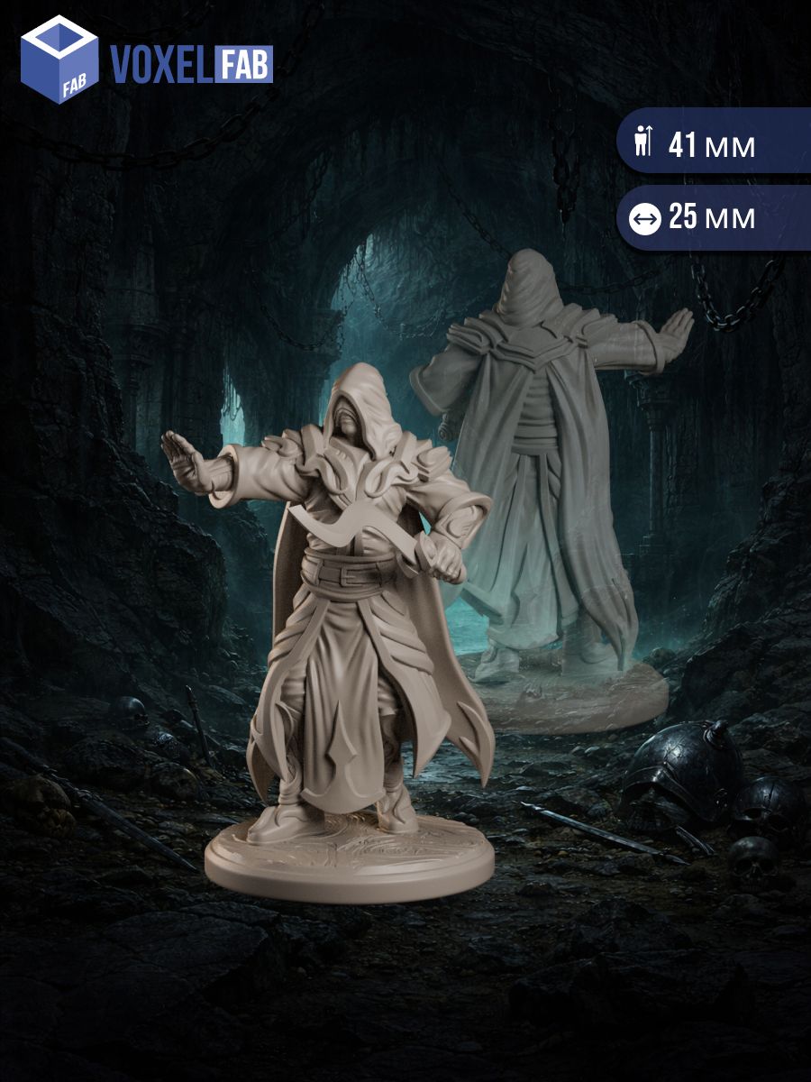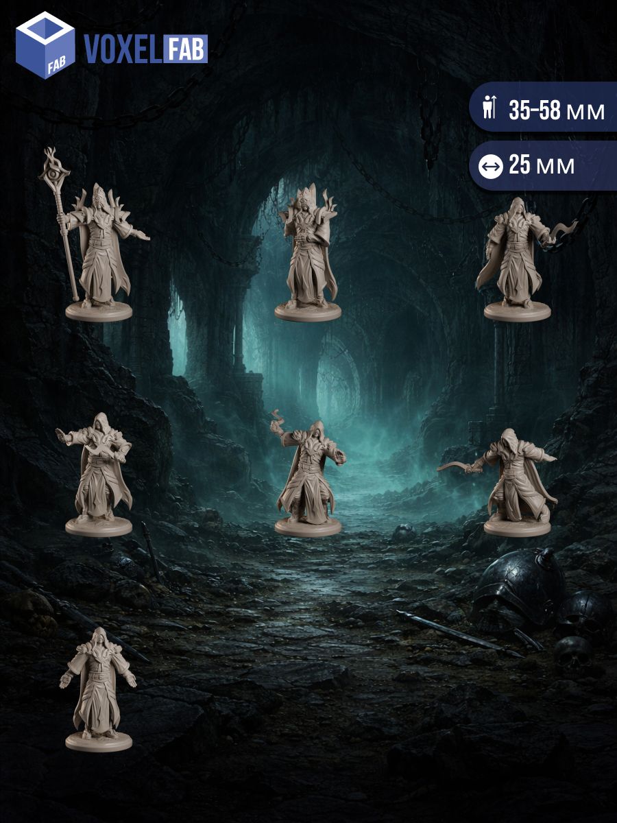 Набор отлично подходит для сцен тайного собрания в подвалах, ночной засады в переулке, штурма запретного святилища или кульминации кампании, где герои сталкиваются не просто с людьми, а с верой, доведённой до безумия. Эти фигуры легко станут и рядовыми фанатиками, и важными прислужниками, которые знают больше, чем должны — и шепчут имена, от которых трескается реальность.