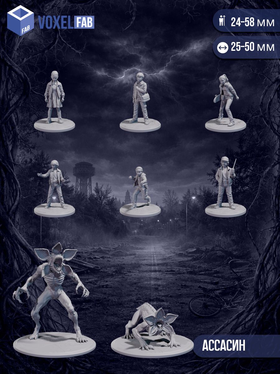 В комплекте — 7 уникальных фигурок: группа детей-героев и жуткие существа из иного измерения. Набор идеально подойдёт для настольных ролевых игр, сценариев с хоррор-элементами, сюжетных кампаний и коллекционирования.