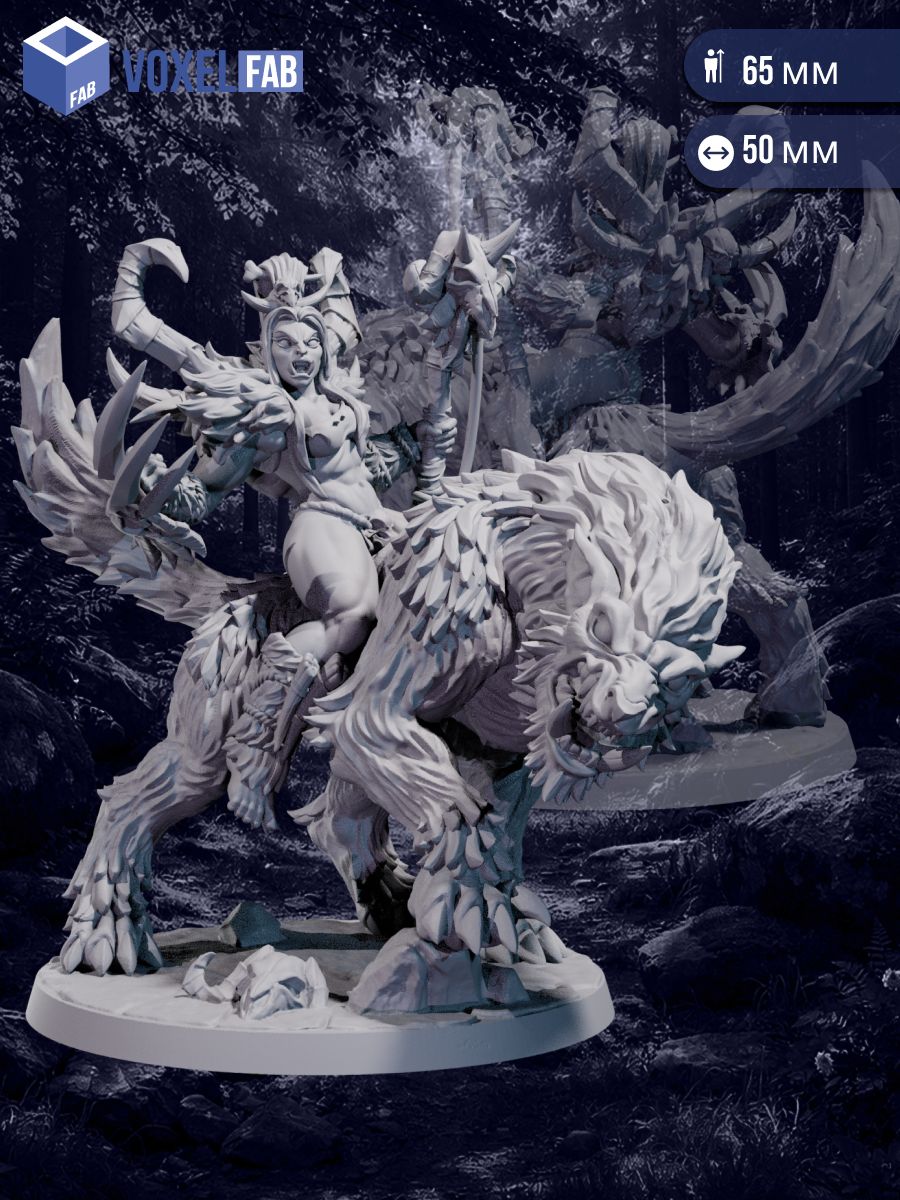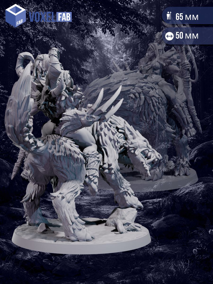 Миниатюра отличается выразительным силуэтом, динамичной композицией и высокой детализацией: доспехи, оружие, зверь и наездница образуют единый драматичный образ, который эффектно смотрится на игровом столе и особенно раскрывается при покраске.