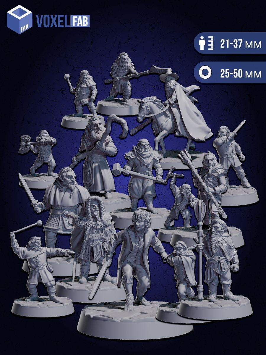 В комплект входят 15 тщательно проработанных фигурок в масштабе 32 мм: гномы-воины, мудрый волшебник, отважный хоббит и их верные спутники. Каждая миниатюра выполнена с высокой детализацией, что делает их одинаково подходящими как для ролевых партий, так и для коллекции.
