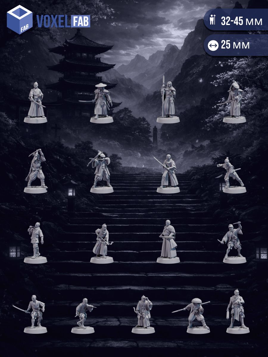В комплекте — 17 уникальных персонажей: воины-ронины, мечники и бойцы в динамичных позах, идеально подходящие для приключений в сеттингах фэнтези, восточных легенд и исторических кампаний.