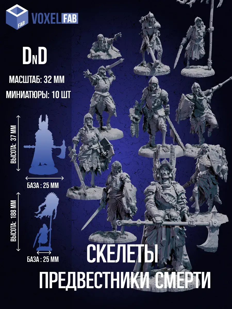Нежить прибывает со звуком, когда кости бьются о сталь. Они носят доспехи павших солдат и носят с собой клинки, которые когда-то принадлежали великим людям. Некоторые из них ползают по серой земле и копошатся в грязи, в то время как другие стоят во весь рост и безмолвны, как могила. Эти армии прибывают только тогда, когда их призывают, и они убивают с безрассудной самоотверженностью. Нежить ничего не видит и не слышит, она знает только свой приказ. Даже когда они распадаются, они будут продолжать сражаться, пока битва не будет выиграна, или пока от них ничего не останется\n\nСкелеты из адского легиона, 10 шт. Набор для настольных игр ДнД (DnD),Pathfinder, НРИ. Масштаб 32 мм (1:56). Миниатюры\n\nМасштаб: 32 мм (1:56).\n\nСет: 10 штук.\n\nВысота скелета: ~ 36-37 мм (от пяток до макушки, без учета базы и выступающих деталей).\n\nДиаметр базы: 25 мм. Базы в комплекте!\n\nЦвет: Космический тёмно-серый.\n\nБережная ручная обработка после печати. Высококачественные материалы. Отличное качество. Бережная обработка.\n\nПоставляется в неокрашенном виде. Внимание! Клей и краски не входят в комплект.